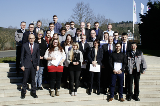 Image: Twenty-eight apprentices have completed their training, acquiring skills in technology, business and IT. Michael Weiher (front row, left), Managing Director, International Production, Rittal; Matthias Hecker (second row, second from right), Head of Training at Rittal; and Tina Pfeiffer-Busch (second row, left), Training Coordinator at the Friedhelm Loh Group, presented graduates with certificates.